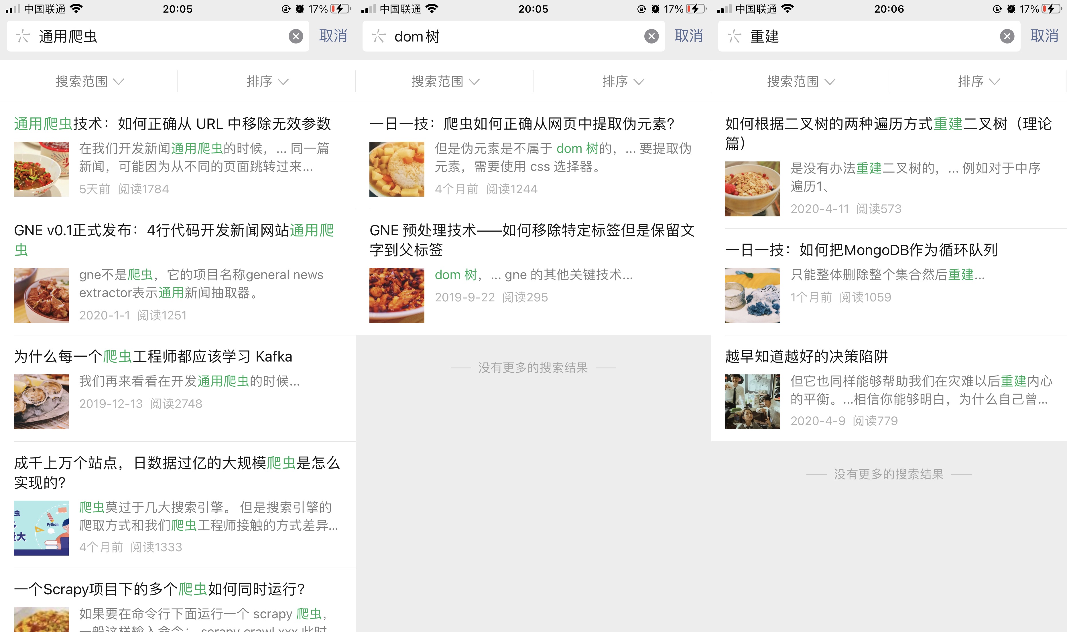 微信的搜索功能真是太难用了。以这篇文章为例:通用爬虫技术要点: Dom树的重建。我们在微信公众号的搜索功能里面输入各种关键词都搜索不到这篇文章: